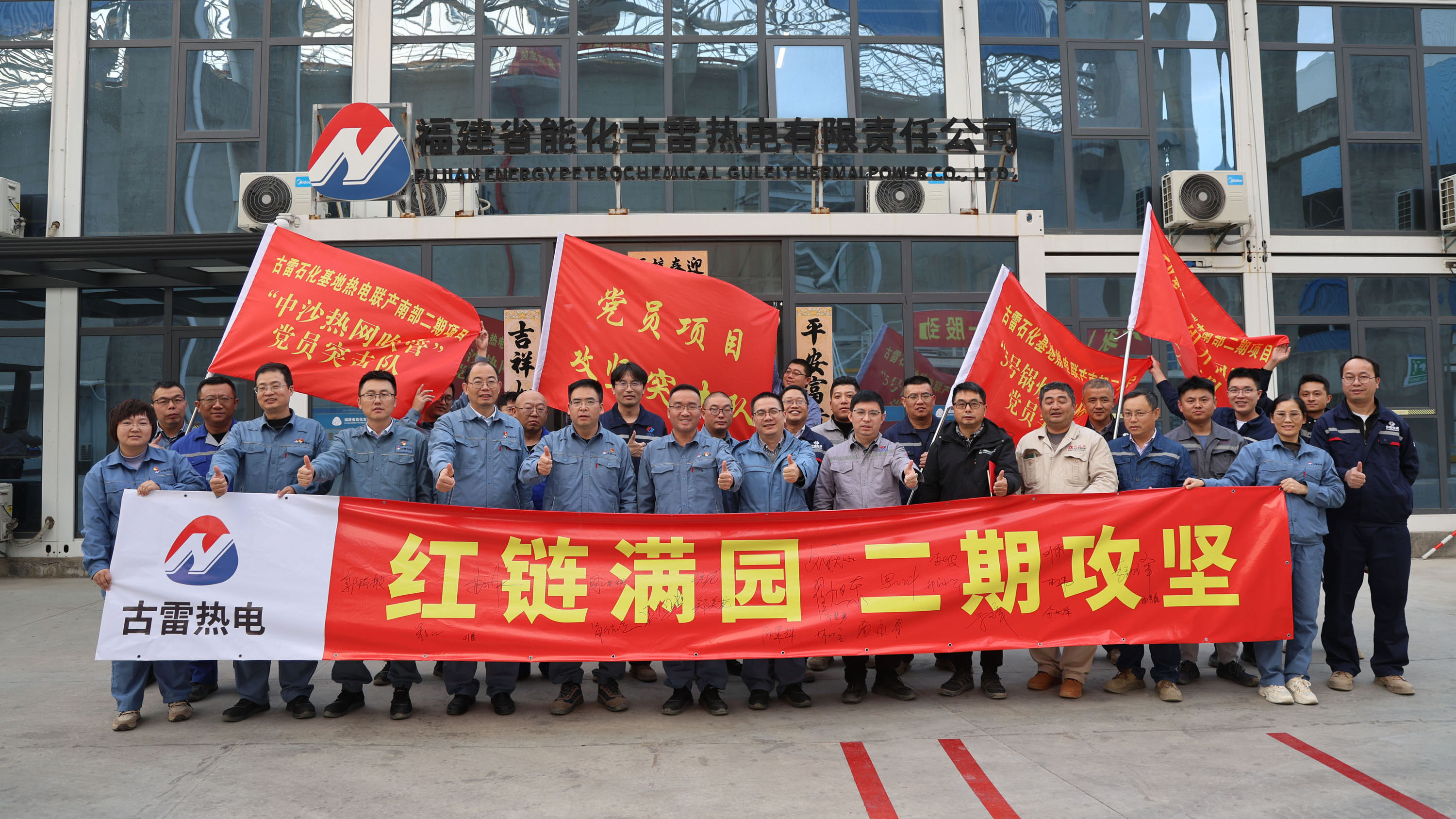 活动最后,全体与会人员在“红链满园 二期攻坚”主题条幅上郑重签名,并合影留念。古雷热电将以此次活动为契机,全力打造“红链满园”古雷石化基地热电联产南部二期项目党员攻坚样板,进一步提升古雷热电“热力先锋·公用堡垒”党建品牌影响力,为如期实现向中沙供汽目标、助力古雷石化基地高质量发展贡献坚实力量!